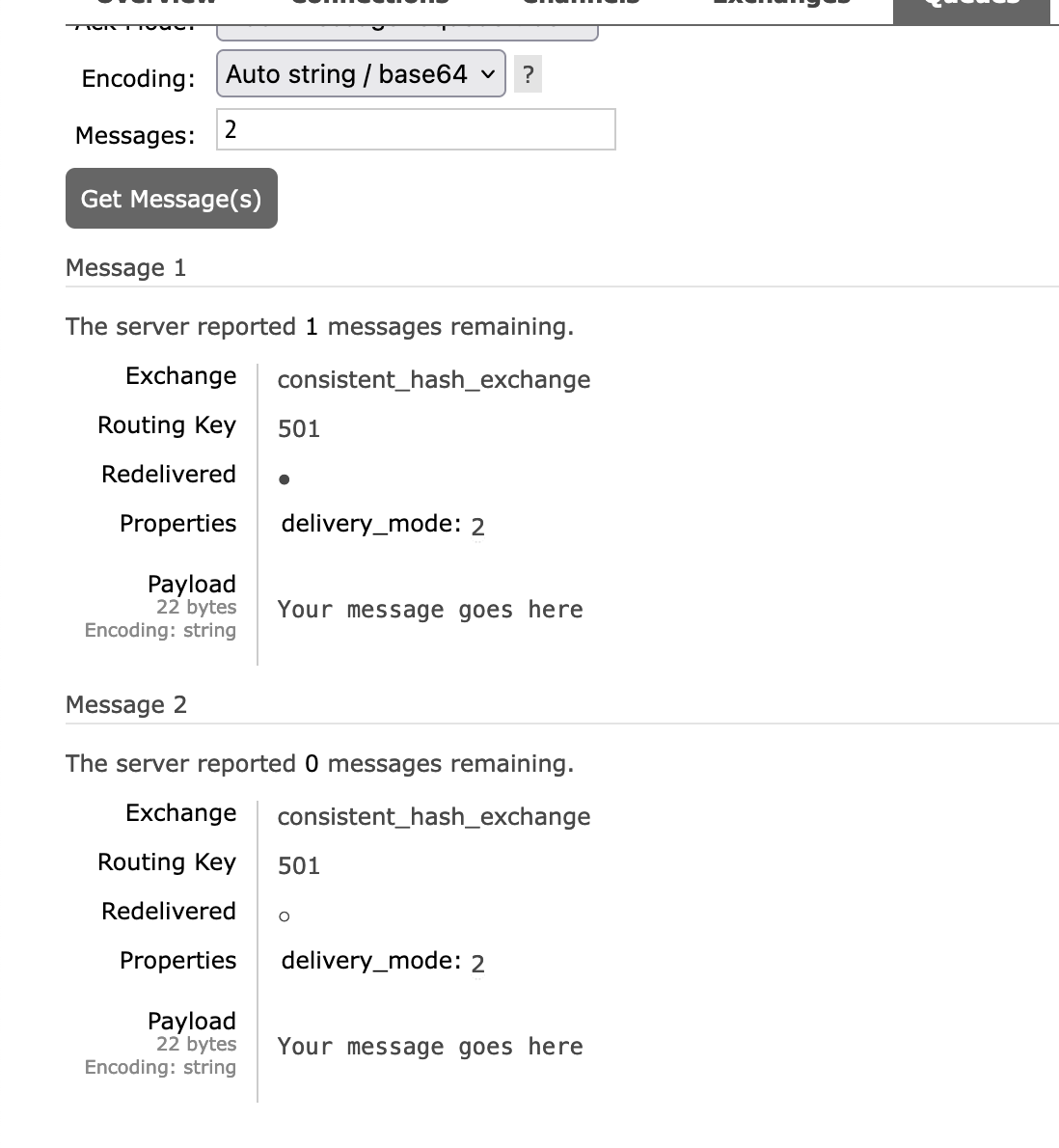 Now take a look at the messages we've sent (twice, I remind you) in this queue....
